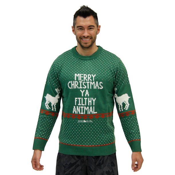 Home alone , movies , season's greetings Accessories , home alone , pet ugly sweaters , pop culture tags: Shop thousands of merry christmas ya filthy animal sweater tote bags designed and sold by independent artists. 5 out of 5 stars. This colorful sweater has a picture of a grumpy old man in a santa hat, the words merry christmas ya filthy animal, and a colorful christmas design surrounding all of it!